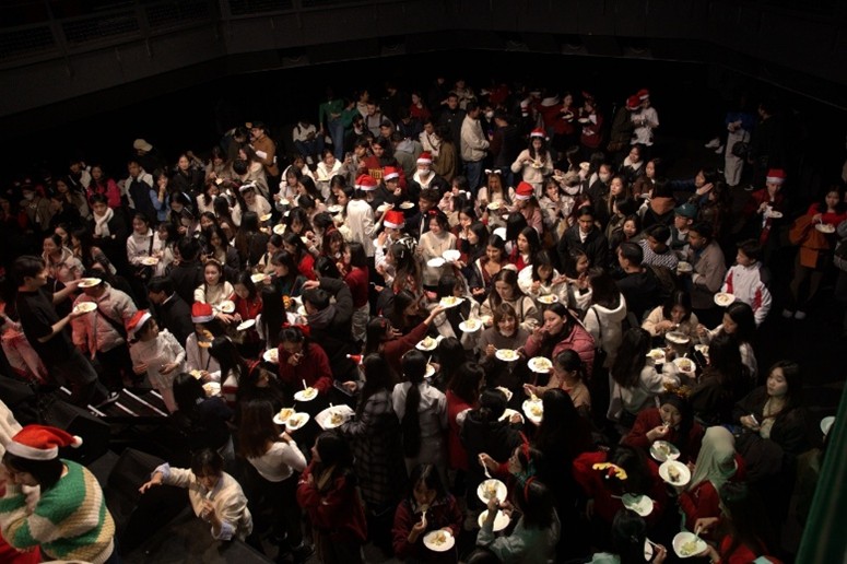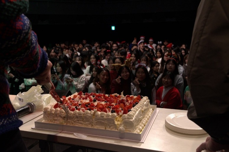 また、先生たちからのサプライズとして、ひと足早い特大クリスマスケーキが用意され、全員で美味しくいただきました。思いがけないプレゼントに笑顔が広がり、会場はさらに温かい雰囲気に包まれました。