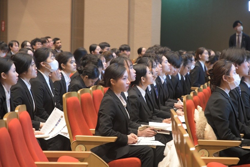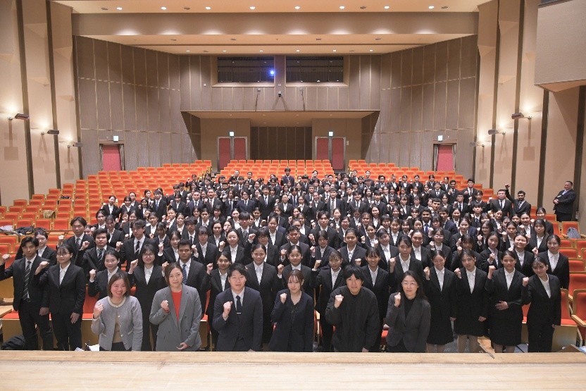 2026年2月3日(火) これから就職活動の本番を迎える1年生約500名を対象に「業界セミナー」を実施しました。このイベントは個々の企業だけでなく、業界全般についての知識が不十分であるという課題を克服するために企画し、多くの先輩が就職しているホテル業界、物流業界、空港利用の拡大に伴い多くの人材を必要としている空港業界の企業の方に講演を行っていただきました。学生はいよいよ始まる就職活動への緊張感でいっぱいでしたが、必死にメモをとりお話いただいた内容の理解に努めていました。内定に向けて、走り出しています!